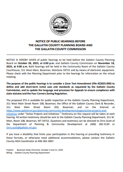 Gallatin County is moving forward with a significant zoning amendment that could set the tone for how short-term rentals are managed for years to come. Officials have locked in December 9 as the date for a public hearing on Z2025-090, a proposal designed to formally define short-term rental uses and establish more detailed operating standards throughout the county.