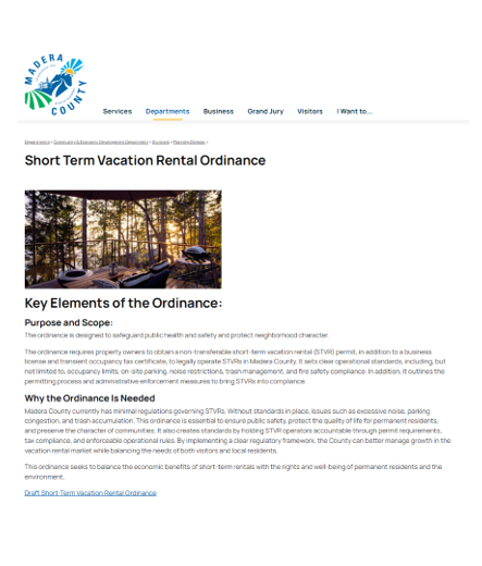 The ordinance itself would introduce a comprehensive framework for short-term vacation rentals across Madera County’s unincorporated areas. Right now, STVRs operate with relatively limited formal oversight. County staff say the proposed rules are meant to clarify expectations for property owners while responding to community concerns about noise, parking, and neighborhood character.