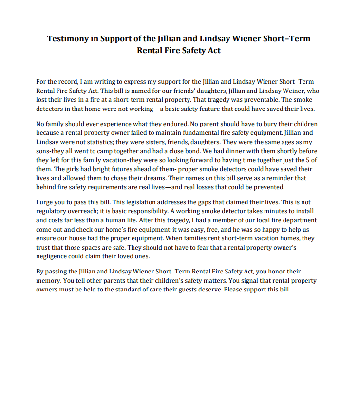 The legislation, known as the Jillian and Lindsay Wiener Short-Term Rental Safety Act, passed Monday with bipartisan support. It mandates that vacation rentals be equipped with working smoke alarms, carbon monoxide detectors, a fire extinguisher, and a clearly visible fire evacuation plan. Properties must also include emergency contact information for first responders.