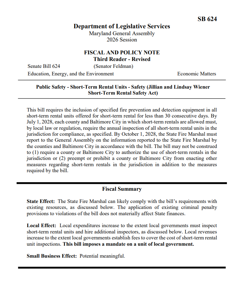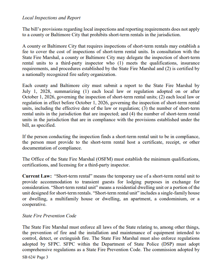 Under the law, counties and Baltimore City will be responsible for implementing and enforcing the rules, including annual inspections. Rental platforms such as Airbnb and Vrbo must verify compliance. Local governments may establish registration fees and authorize third-party inspectors.