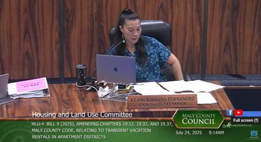 Maui County is one step closer to a massive shift in its housing and tourism balance. On July 25, the County Council’s Housing and Land Use Committee advanced Bill 9, a hotly debated measure that would eliminate more than 7,000 short-term rentals (STRs) in apartment-zoned districts over the next five years.