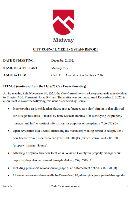 In another shift, property managers for STRs must now be licensed directly through Midway City, though they can operate from anywhere in Wasatch County. Within the TROD, hosts must hold a business license themselves and must hire a Midway-licensed property manager.