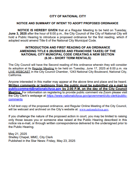 For now, the message is clear: National City is serious about tackling STR issues, but wants to get the rules right. Whether the revised ordinance comes back on June 17 or later in the summer, change is on the horizon.