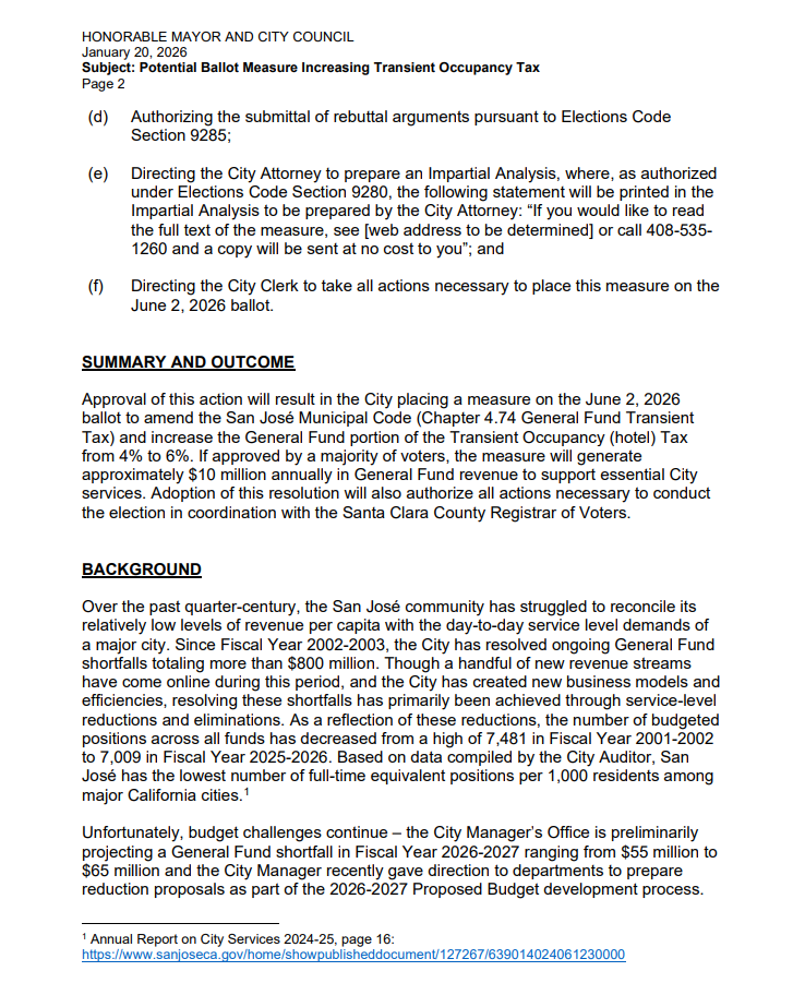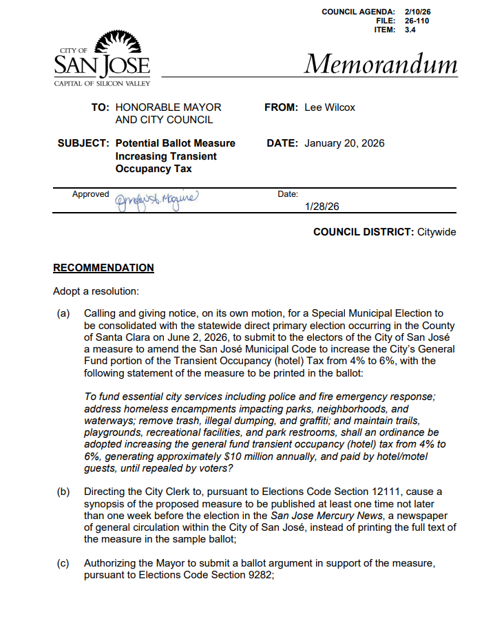 San Jose leaders are weighing a proposal to raise the city’s hotel tax as they confront yet another major budget shortfall. The City Council is set to review a ballot measure that would increase the transient occupancy tax from 10% to 12%.