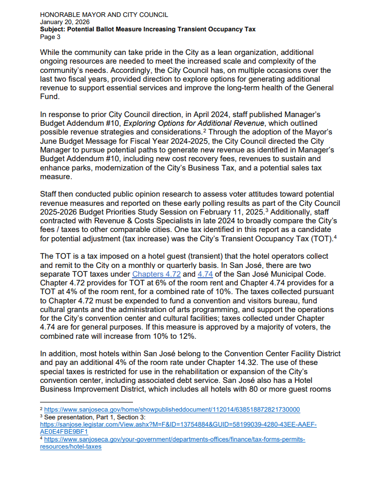 City officials argue the increase is modest. Even at 12%, San Jose’s hotel tax would remain below nearby competitors. San Francisco and Oakland both levy 14%.