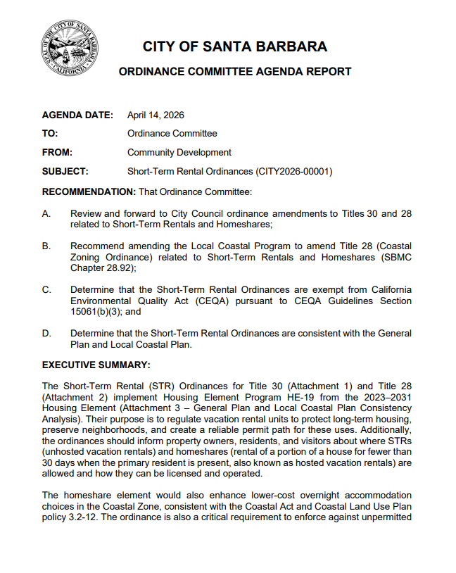 Santa Barbara Moves Toward New Short‑Term Rental Rules: Ordinance Committee reviews proposal to restrict whole‑home rentals and expand on‑site home‑sharing
