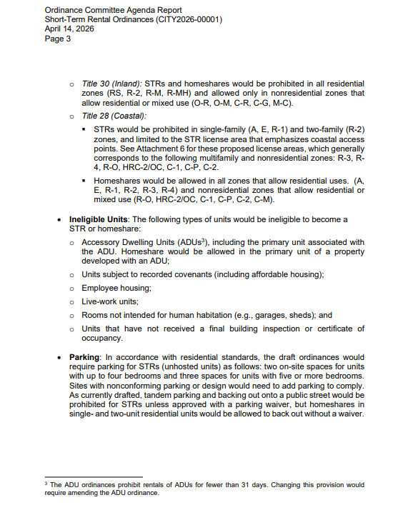 Under the proposal, operators of short‑term rentals — defined as stays under 30 days — would be required to obtain permits, undergo inspections and provide proof of insurance. The ordinance would also limit where rentals are allowed and increase enforcement against illegal listings, many of which continue to operate despite existing prohibitions in residential zones.