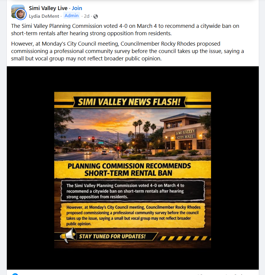 Simi Valley Planning Commission Recommends STR Ban