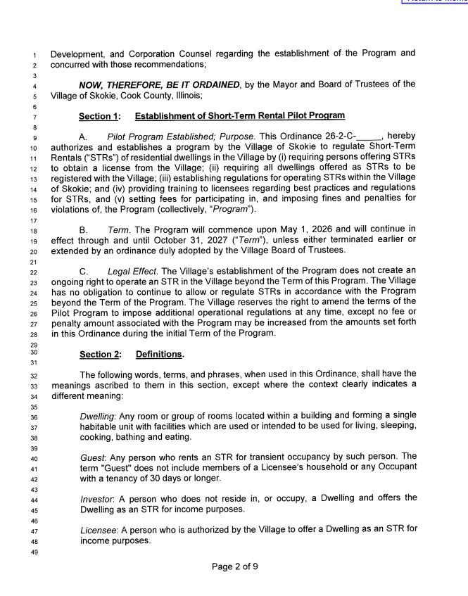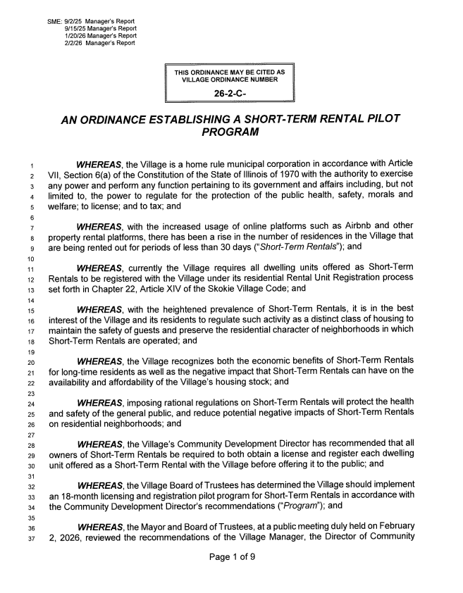 Skokie moves forward with a pilot program to regulate short-term rentals, giving the village new authority over properties listed for fewer than 30 days. In a 5-1 vote, trustees give the green light to Ordinance No. 26-4633, a law that sets strict limits on rentals listed on platforms like Airbnb.