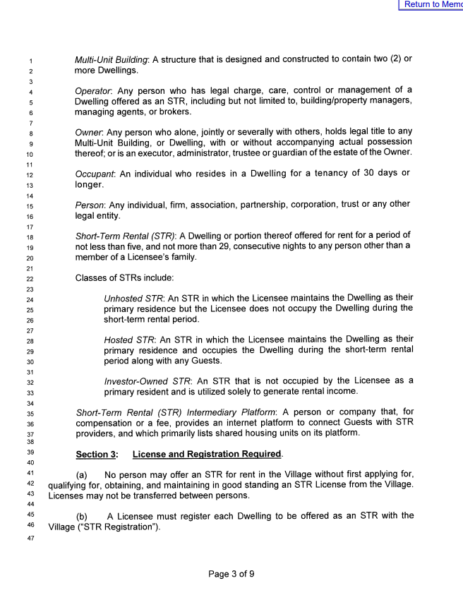 Under the ordinance, owners must register their rental by April 1. Registration requires a $1,200 operator license, at least $2,450 in fees, completion of a village training program, a building inspection, and notification to neighbors within 250 feet. The law takes effect May 1.