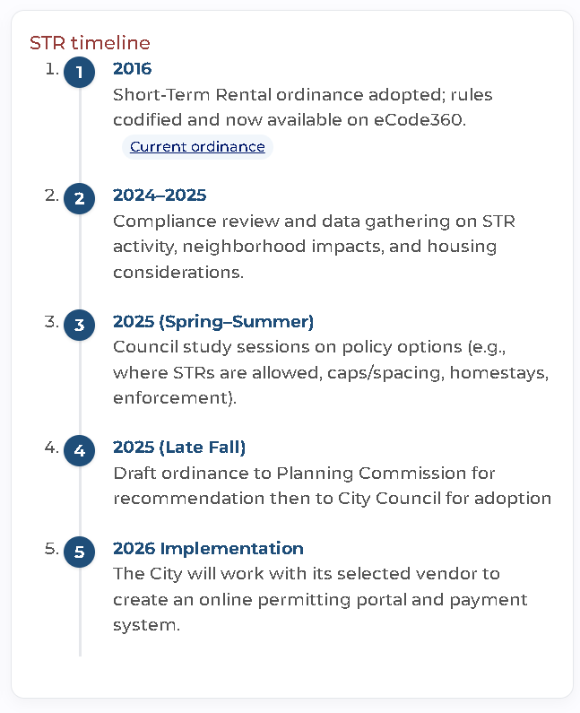 The ordinance, first adopted as an emergency measure in 2014 and codified in 2016, has struggled to keep pace with the rapid growth of platforms like Airbnb and VRBO. Community Development Director Rafael Castillo explained that the existing rules lacked enforcement tools, safety requirements, and caps on permits. They also failed to address housing availability concerns, especially as California pressures cities to preserve long-term housing.