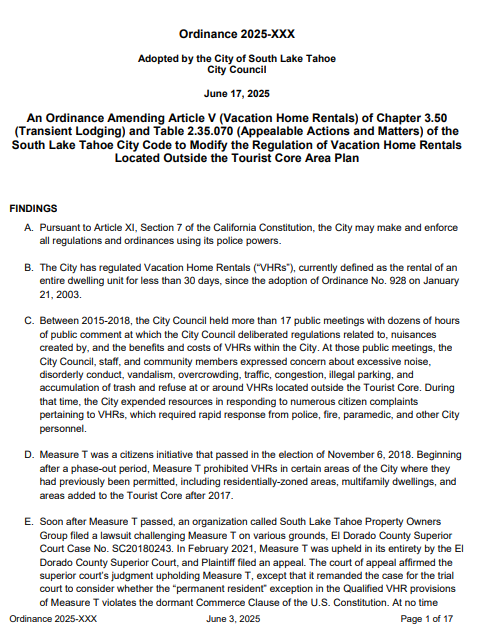 South Lake Tahoe is taking another big step to tighten the reins on vacation rentals. In a first reading on June 3, the City Council advanced a revised Vacation Home Rental (VHR) ordinance that brings in a host of new regulations aimed at protecting residential neighborhoods. If formally adopted on June 17, the ordinance will take effect July 17.