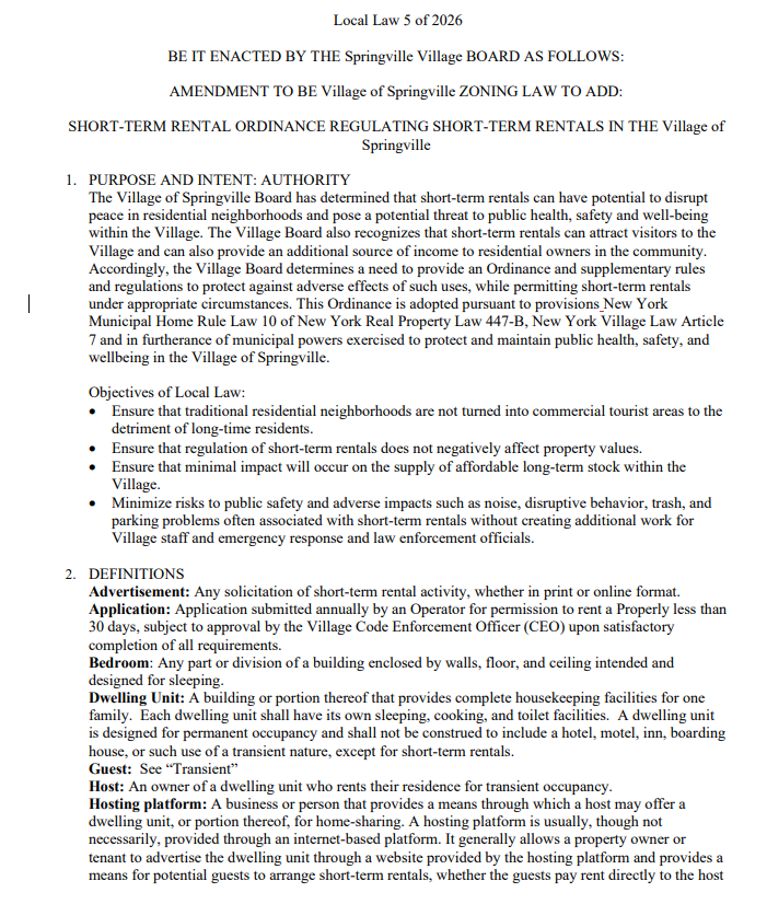 After months of discussion and a growing need to regulate short‑term rentals, the Village of Springville Board of Trustees voted on March 16 to approve Local Law 5 of 2026, establishing the village’s first full set of STR rules.