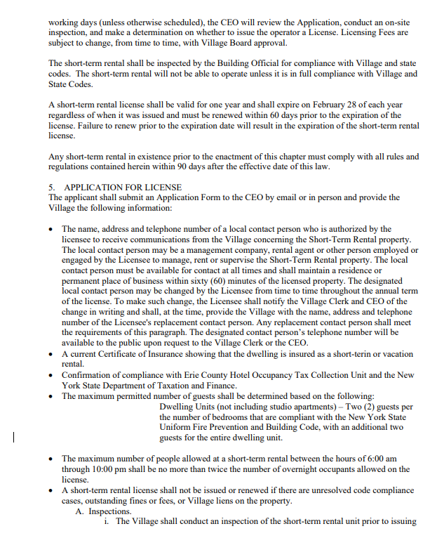 Licenses must be obtained from the code enforcement officer, who will verify compliance before issuing or renewing a permit. Failure to meet ongoing requirements can result in revocation. Fees range from $100 to $400 for owner‑occupied homes and $250 to $750 for non‑resident owners, depending on the number of bedrooms.