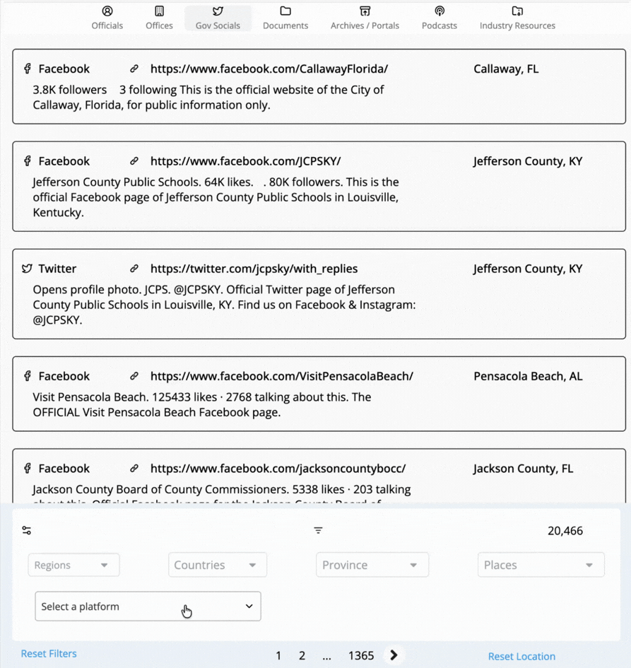 On the Gov Socials side, platform icons have been added to entries alongside a platform filter spanning Twitter, TikTok, Instagram, Facebook, YouTube, and LinkedIn.