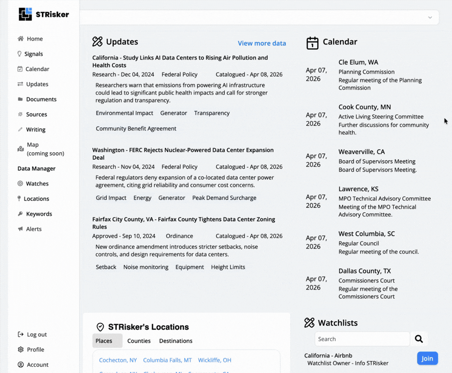 STRisker offers tools and features to keep you updated with the Short Term Rental movement (and now Data Centers!) movement across the world.