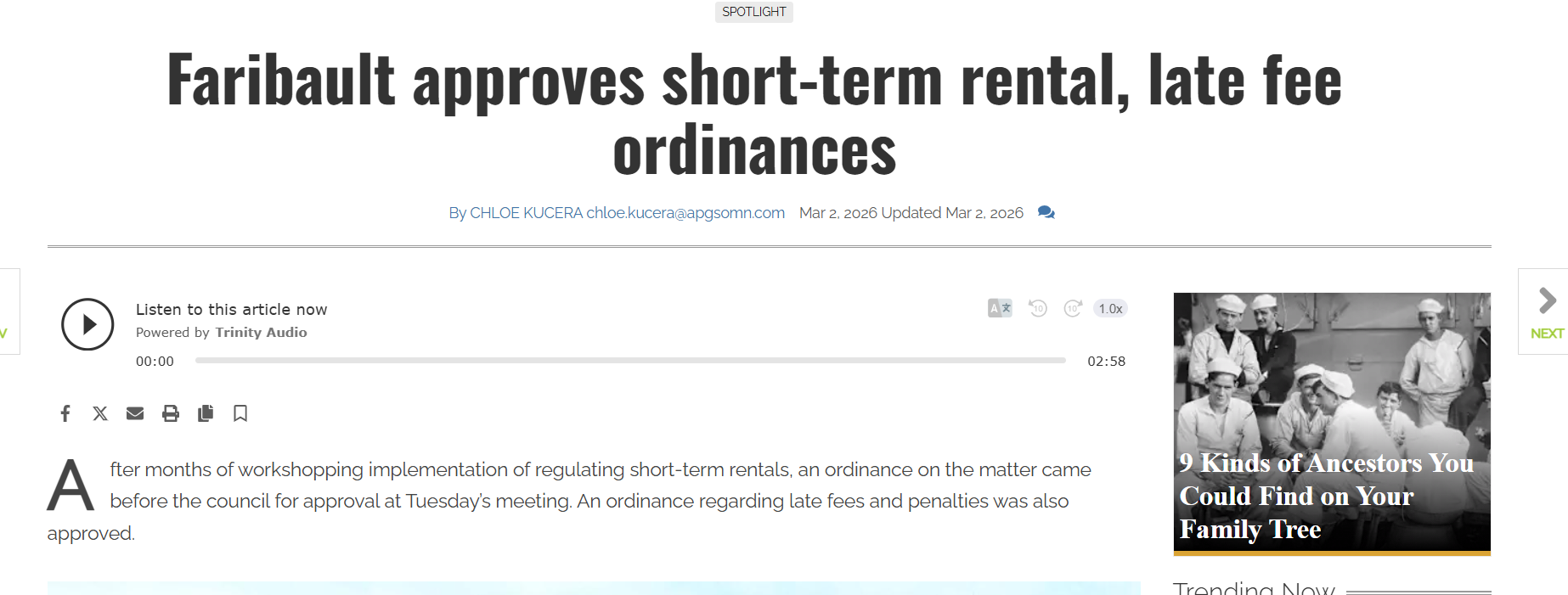 Officials in Faribault approved a new ordinance establishing a regulatory framework for short-term rentals, allowing the city to collect lodging taxes and conduct safety inspections of rental properties.
