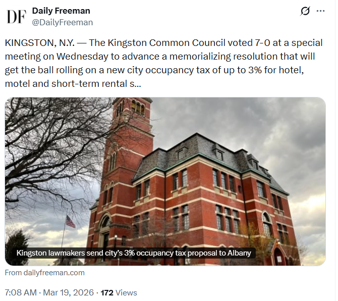 - Kingston, NY: Officials in Kingston are advancing plans for a local occupancy tax that would apply to short-term rentals and traditional lodging, following a 7-0 council vote to initiate the state approval process.